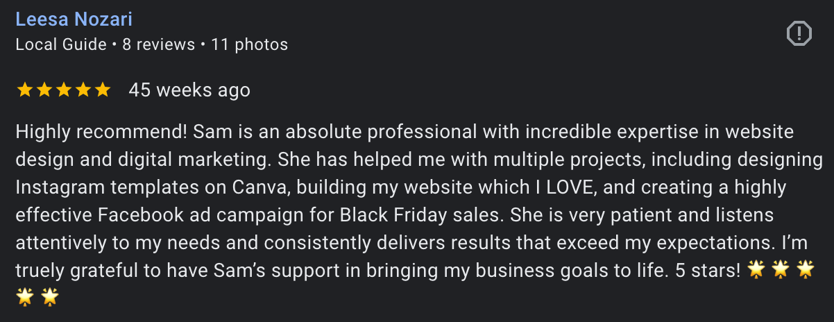 “You did a wonderful job bringing my vision to life, you helped me so much, thanks [Sam]”